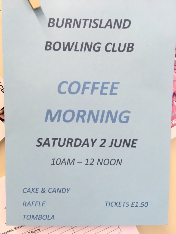 BURNTISLAND BOWLING CLUB COFFEE MORNING Posted on May 15, 2018 by chdot SATURDAY 2 JUNE 10AM – 12 NOON CAKE & CANDY TICKETS £1.50 Poster in Coop. Share this: Click to share on X (Opens in new window) X Click to share on Facebook (Opens in new window) Facebook Like Loading...